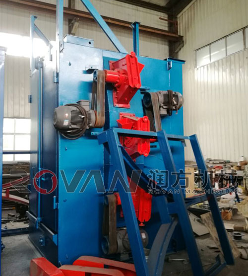②、目前常見的吊鉤式拋(pāo)丸機的拋丸清理室的室體結構均為長方(fāng)體結構,由於(yú)工作(zuò)中該拋丸機工件邊旋(xuán)轉、邊被(bèi)拋丸清(qīng)理,故其運動軌跡為圓形,顯然室體采用長方體結(jié)構使得結構尺寸和占地空間(jiān)大,拋丸空間利用率低。同時(shí),這種長(zhǎng)方形的室體結構在設(shè)計時,拋(pāo)丸量小(xiǎo)時在拋丸清理底部設置一個螺旋輸送(sòng)機,拋丸量大時設置橫向和縱向兩(liǎng)個(gè)螺旋輸送機,將落(luò)在室體底部的丸砂混合物輸送至提升機,使得動力消耗以及生產成本有所提高。